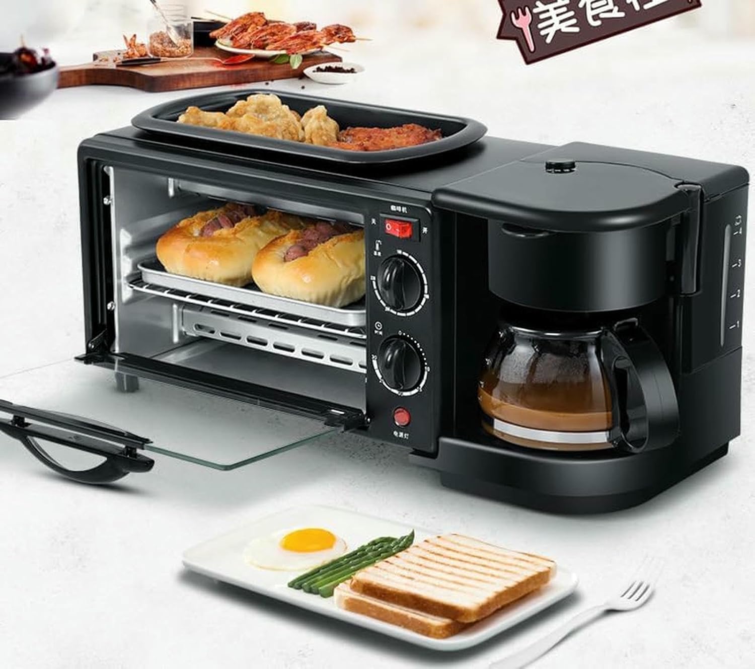 Transform your morning routine with this versatile 3-in-1 breakfast station that combines a toaster oven, coffee maker, and mini grill in one space-saving design. The generous 15L capacity toaster oven is perfect for serving 4-5 people, making it ideal for family breakfasts or small gatherings. The mechanical controls feature 4-5 timer levels, giving you precise control over your cooking. Built with durable stainless steel construction, this breakfast station includes a practical baking rack and dust cover for convenience and easy maintenance. Operating at 110V with 1100W of power, this efficient appliance delivers quick and delicious results. The sleek black finish adds a modern touch to any kitchen counter while saving valuable space. Whether you're brewing your morning coffee, toasting bread, or grilling breakfast meats, this all-in-one station helps you prepare multiple breakfast items simultaneously, streamlining your morning meal preparation.