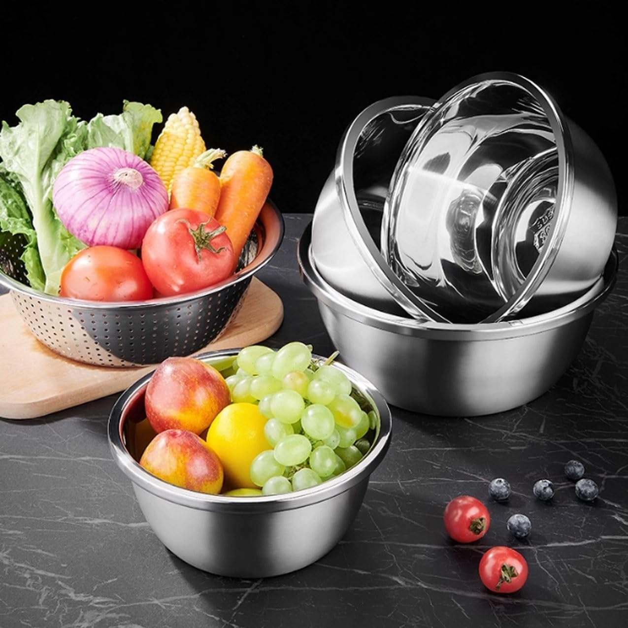 Products Name: Mixing Bowls Pots and Pans Cooking Baking Metal Nesting Storage Bowls 5 Piece Set Salad Bowls 304 Stainless Steel Soup Bowls Barbecue Serving Trays Mixing Bowls Material: 304 stainless Steel. Applicable: Induction cooker, gas stove, electric ceramic stove, electric heating stove, Heated Cooking food. Multifunctional Application: Baking egg and noodle mixing bowls, barbecue service trays, kitchen cooking heating, storage services, outdoor travel and picnics, easy to carry, stacked storage, and space saving. Mixing Bowls Size Specification 24cm, outer diameter 24cm, height 9.5cm. Specification 26cm, outer diameter 26cm, height 10.5cm. Specification 28cm, outer diameter 28cm, height 11.0cm. Specification 30cm, outer diameter 30cm, height 12.0cm. Leaky-Basin Specification 30cm, outer diameter 30cm, height 10.5cm. Package 5* Mixing Bowls