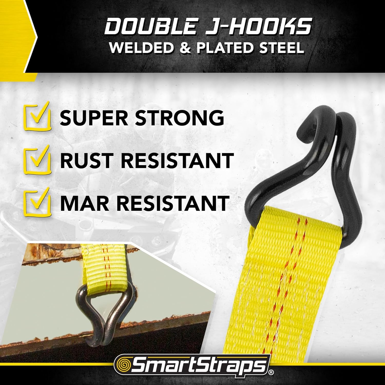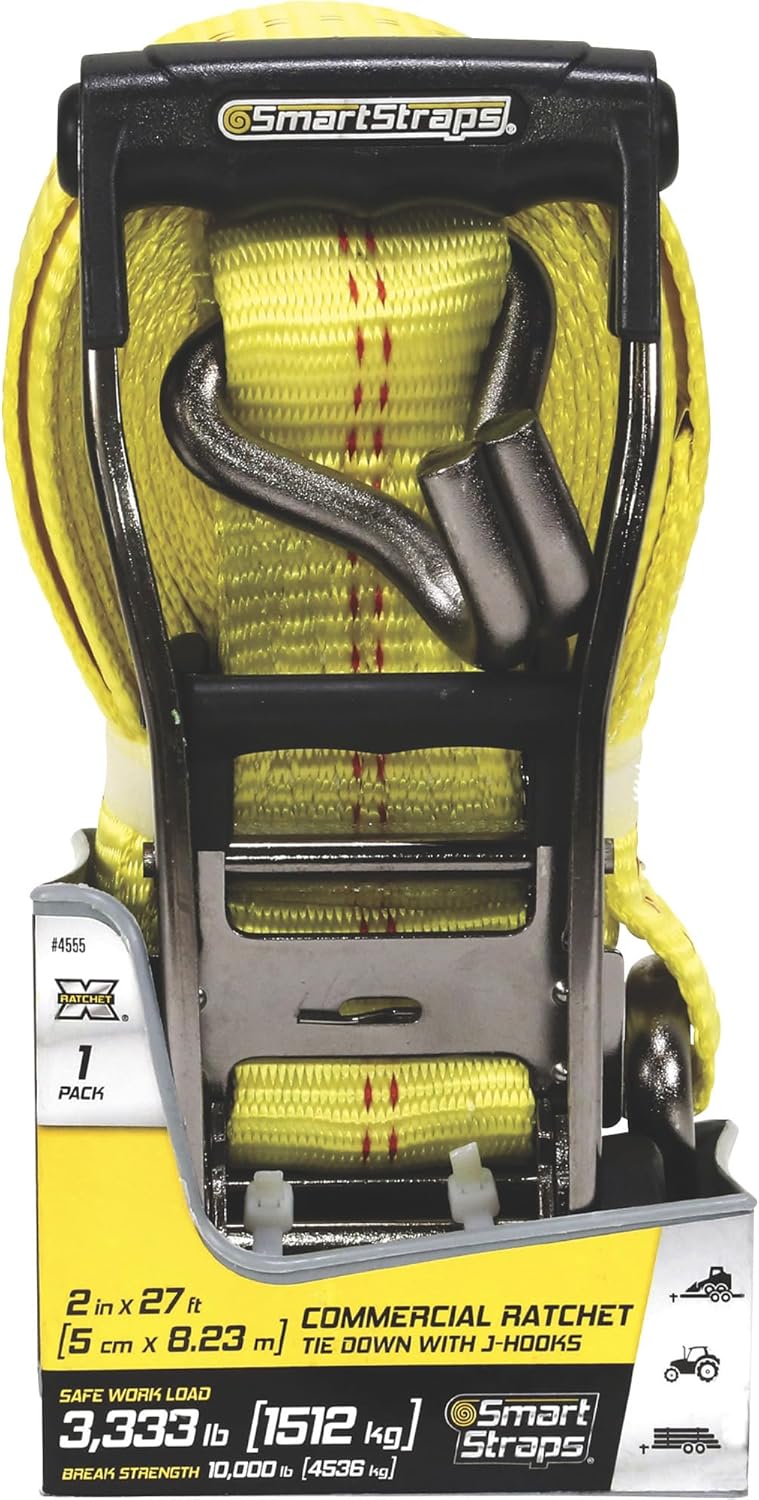SmartStraps Commercial-Grade Black Nickel Ratchet Tie-Down Strap - 2in. x 27ft. with J-Hook, 10,000-Lb. Breaking Strength, Yellow, Model Number 4555