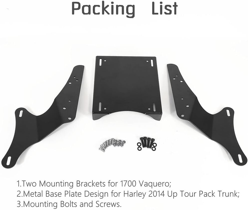 Specifications:Type: Luggage Rack Condition: NewColor: Matte BlackMaterial: Made of Heavy duty billet aluminum and premium quality steelFeatures:①Custom trunk mount, provide more comfortable place for passenger②Love your time on the road, great feeling for riders in the wind③Easy installation, lets you easily remove them when don't need them.Fitment:Fits for Kawasaki Motorcycle Accessories 2010-2023 Vulcan 1700 Vaquero VN1700 (Matte Black) luggage rack Installation:Just need to install on original saddlebag holes with saddlebag bolts.Some Models may need to install with K53020-405 MOUNTING KIT (not included). Please check your saddlebags hole dimensions.Package:1x Rear Luggage Rack (Only Luggage Rack )Not included Installation instructionsOur services:Our goal is 100% customer satisfaction. Please contact us by Amazon if you have any questions.