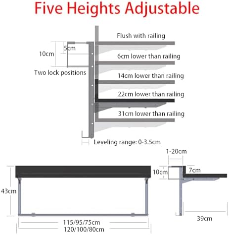 Elevate your outdoor space with our hanging balcony table, a perfect blend of style and functionality. Constructed from a durable aluminum alloy and stainless steel frame, this table is engineered for longevity. The high-quality aluminum tabletop is finished with a high-temperature polyester powder coating, ensuring it withstands the elements while maintaining its sleek appearance. Designed with convenience in mind, this table features a 90-degree folding angle and a lifting range of 36 cm, allowing for adjustable height to suit your needs. Its stainless steel accessories provide stability and strength, making it a reliable addition to your balcony or patio. This versatile table is compatible with various railing types, including square metal, double square, radiator, wood, and round metal railings, making it an ideal choice for different outdoor settings. Product Features: - Sturdy and durable construction for long-lasting use - Five adjustable options for versatile applications - Foldable design with rounded corners for safety and practicality - Easy installation process for a quick setup Enhance your outdoor dining experience or create a cozy nook for relaxation with this stylish hanging table. Perfect for enjoying your morning coffee, reading a book, or entertaining guests, it adds both functionality and elegance to your outdoor living area. Please note: manual measurements may have an error margin of approximately 1-2 cm. Thank you for your understanding.