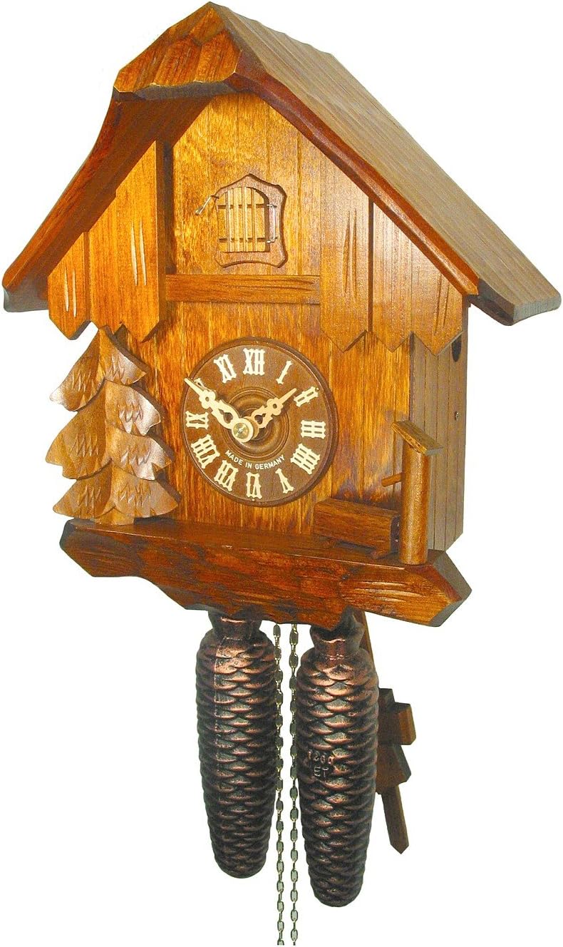 Colour: Walnut Executions: Classic Wooden dial, wooden hands, wooden bird, and night shut off 2 years product warranty The cuckoo calls every half hour once and the number of the hours every full hour. This cuckoo clock has an exclusive life-like wooden handpainted cuckoo. With certificate of authenticity from the Black Forest Clock Association (VdS). It has a mechanical extreme long-life rack strike movement. It allows turning the hands left and right without endangering the mechanics of the movement. The 8 day running time movement need to be wind up once a week, that means you pull on the chains until the weights are up. The size refers only to the clock, without pendulum and weights.