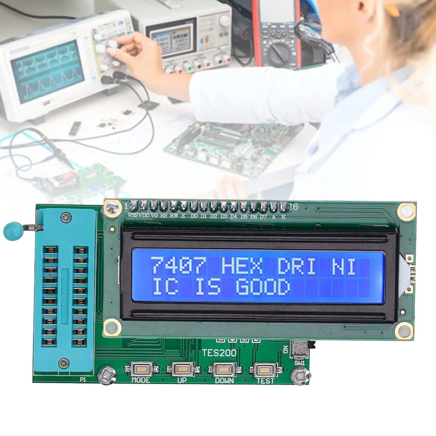 1. TES200 Digital Integrated Tester: Easily test over 200 types of 74 and 40 series digital integrations. Quickly determine which logic gates are faulty with simple button operation. 2. Quick Response Time: Integrated circuit tester get results in as fast as 3 seconds after testing. Convenient and efficient for troubleshooting, improving work efficiency. 3. Compact Design, Easy to Use: Small and delicate appearance for easy Select and test integrations with the press of a button. 4. Material: Made of PCB material, this IC tester is and for long term use. Works efficiently in temperatures from ‑40℃ to 65℃. 5. Ideal Replacement: Wonderful replacement for the old and damaged parts, fine workmanship, attention to details, helps you improve the working efficiency! Specification: Item Type: Integrated Circuit Meter Material: PCB Operating Current: Operating Temperature: -40℃ to 65℃ Storage Temperature: -40℃ to 65℃ 74 series: 7400, 7401, 7402, 7403, 7404, 7405, 7406, 7407, 7408, 7409 7410, 7411, 7412, 7413, 7414, 7415, 7416, 7417, 7418, 7419 7420, 7421, 7422, 7424, 7425, 7426, 7427, 7428, 7430, 7432 7433, 7434, 7435, 7436, 7437, 7438, 7439, 7440, 7442, 7443 7444, 7445, 7446, 7447, 7448, 7454, 7464, 7470, 7472, 7473 7474, 7475, 7476, 7477, 7478, 7480, 7482, 7483, 7485, 7486 7487, 7489, 7494, 7495, 7496, 74101, 74102, 74103, 74107, 74108 74109, 74112, 74113, 74125, 74126, 74128, 74130, 74132, 74133, 74134 74135, 74136, 74137, 74138, 74139, 74140, 74145, 74147, 74148, 74151 74152, 74153, 74155, 74156, 74157, 74158, 74160, 74161, 74163, 74164 74165, 74166, 74171, 74173, 74174, 74175, 74176, 74177, 74180, 74182 74190, 74191, 74192, 74193, 74194, 74195, 74197, 74242, 74243, 74247 74248, 74249, 74251, 74253, 74256, 74257, 74258, 74259, 74260, 74266 74279, 74280, 74283, 74290, 74293, 74295,