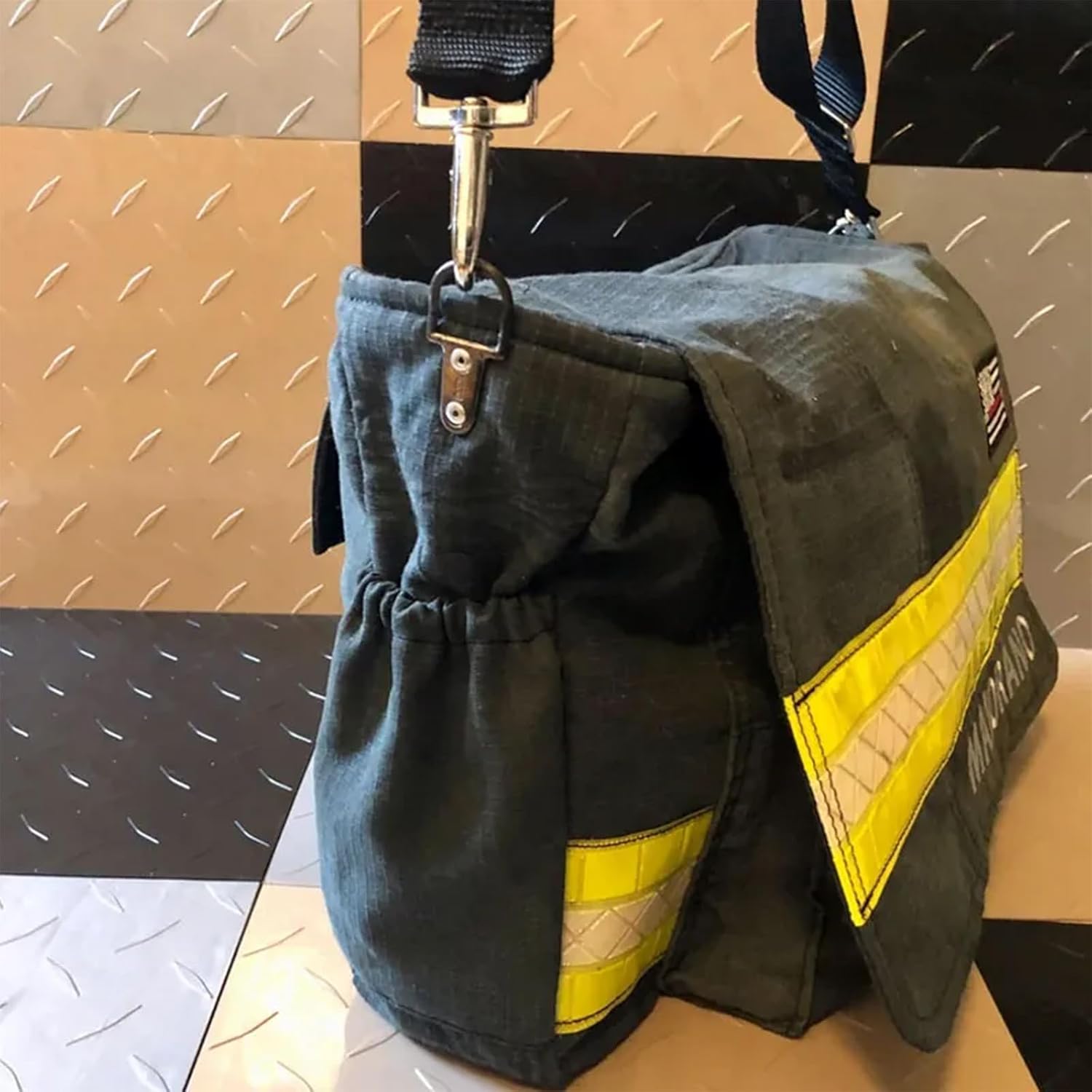 This HIGHLY DEMANDED Firefighter Duffle Bag is the perfect companion for any firefighter on the go. This bag is made from a durable 600 Denier Waterproof Polyester Ripstop ensuring that your belongings stay safe and dry during your travels. Whether you're headed to the gym or an overnight shift, this bag will keep all of your essentials organized and secure. With its stylish design and custom name, you'll be sure to stand out in a crowd. Get your personalized firefighter duffle bag today and show your appreciation for our brave heroes! 600 Denier Waterproof Polyester Ripstop Reinforced Foot Pads Reinforced Attachment Points Includes (2) Detachable Shoulder Straps (8) separate zipper pockets Total Bag Measures 25"x12"x12" Personalized with the Name of your choice! Names are Professionally Thermal Bonded for durability (NOT STITCHED) MATERIALS: Made from a heavy weight 600D waterproof ripstop material. The main compartment is fully lined and has a padded bottom to protect your stuff. Bags are available in both Tan and Black.