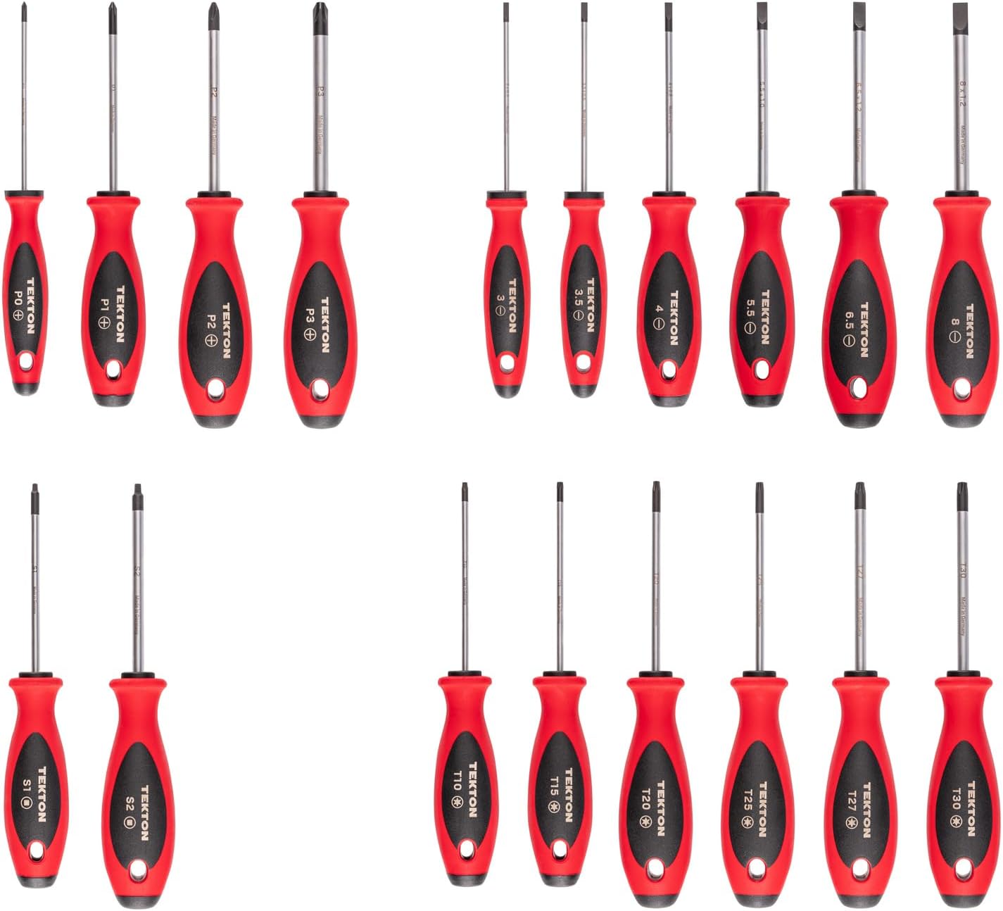 Tekton screwdrivers have handles that are designed for speed and torque. The front of the handle is round for quick turning and the middle transitions to a tri-lobe shape that provides a secure grip for high-torque driving. The handle’s red exterior is made of a lightly textured TPE material that is slightly soft and grippy for controlled spinning, fine adjustments, and reduced slipping under torque. Handle materials resist most common shop chemicals. Each driver has the tip size engraved in four locations with high-contrast laser markings. Each screwdriver handle has the same size through-hole so you can hang it on a hook. You can also attach a safety lanyard when working at heights to prevent drops. Tips are precisely machined and coated with black manganese phosphate, creating a slightly rough surface that enhances screw engagement. The conversion coating produces a uniform, corrosion-resistant layer that preserves tip geometry and doesn’t chip or flake off. The end of the shank is flattened to form a broad surface that resists twisting inside the handle. The handle is molded around the shank, creating a solid connection that is stronger and straighter than simply pressing the shank into a premade handle. This set includes Phillips (JIS compatible) and slotted drivers with modular driver organizers.