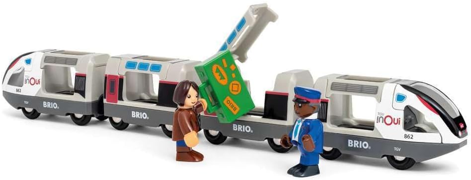 Travel from Paris to the French Riviera aboard the 36087 Train TGV INOUI SNCF, from the Trains du Monde Collection. True to a true TGV, this high-speed train is the longest train in the BRIO World and can accommodate up to 6 characters. The INOUI SNCF TGV covers a large part of France and connects to other countries such as Italy, Spain and Germany. Discover the iconic railway lines and trains from around the world with the World Trains Collection. About BRIO World BRIO World is our open play system that grows with your child. All BRIO World toys are compatible with each other and thus create a fully customizable world, ideal for stimulating growing minds. The combinations of games are endless and waiting for you to explore them. This train fits perfectly: just choose a piece and start building your universe. The 36087 Train TGV INOUI SNCF – Trains du Monde includes 7 pieces: 2 manual locomotives, 2 passenger cars, 2 characters from the BRIO World and 1 suitcase as an accessory.