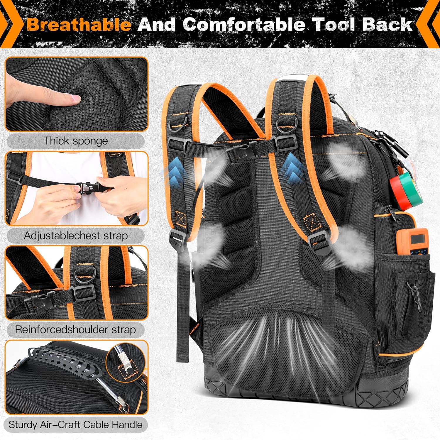Tool Backpack, HVAC Tool Bag with Molded Base, Full Opening Electrician Tool Backpack for Men Heavy Duty, Tools Organizer Bags for Jobsite Work Handyman, Large Pockets & Combination Lock