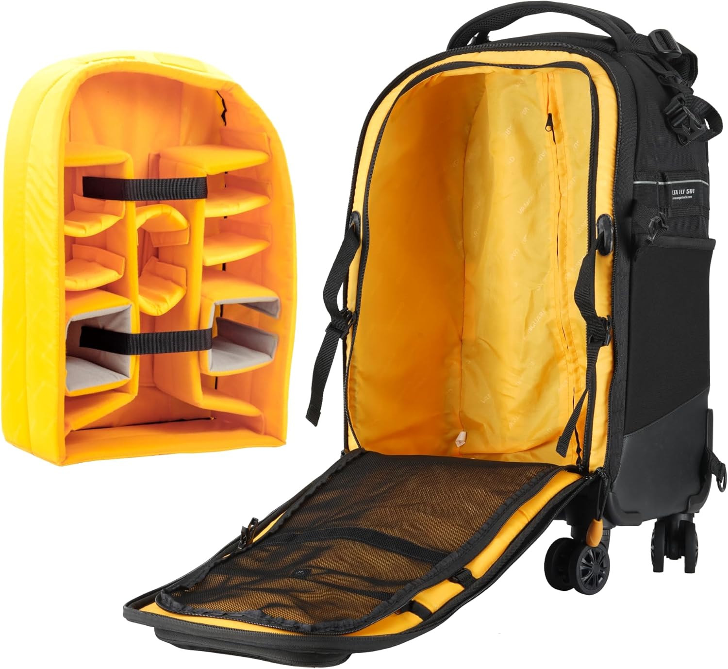 The ALTA FLY 58T airline carry-on*, spinner-backpack is designed to face the challenges professional photographers face when traveling all over the world. Constructed from durable, anti-scratch, moisture resistant materials, this bag is built to withstand years of long-haul wear and tear. Ultra-secure, it features a ‘3 Security Point System’; buckle lock over the external zipper and an internal full-coverage zippered mesh flap so that you never need to worry about prying hands or eyes. Last but not least it is fully customizable so that you can dictate the content capacity, and when you arrive open up and find the best working tool for the job you came to shoot. The ALTA FLY 58T’s well-padded internal compartment opens fully for ease of use and the multitude of versatile dividers can be adjusted to fit 1-2 Pro DSLRs, 4-6 lenses (up to 300mm f/2.8), a flash unit, and accessories, or use the dedicated dual use/dual color drone action dividers to fit a drone with all related items. The organized storage system will facilitate all your travel needs while on-the-go as well as an efficient workflow while on location: separately padded compartments will fit a tablet and up to a 14” laptop. Large external front pockets with organizer inside will store all accessories you need close at hand when traveling. The ALTA FLY 58T is an agile eight-wheel trolley, with a double bar handle and sturdy top and side grips. It also sports an advanced backpack harness that tucks out of the way when not in use, and pull out wheel covers to be used when carrying on your back. Ready for all eventualities we have reinforced the bag with durable water/scratch resistant material along the bottom and included our total coverage rain cover. *Airline carry-on regulations are subject to change and vary by airline and country