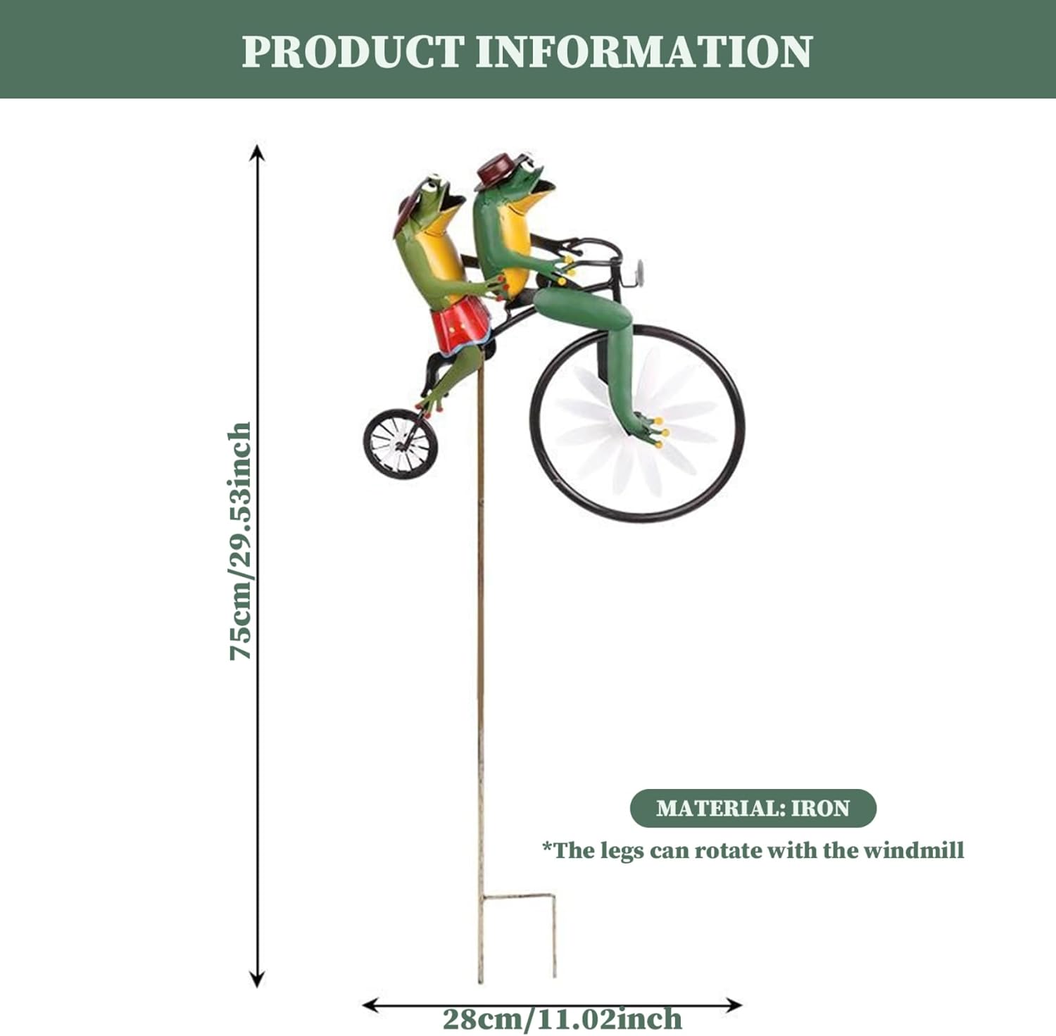 Wind Sculptures, Wind Spinners for Garden Vintage Bicycle Metal Wind Spinner Frogs on a Bike Windmill Garden Ornament 3D Animal on Bike Sculptures for Yard Lawn Garden Decor Description: Cute animal on a motorcycle statue, a delightfully fanciful garden decoration with a unique spin when the wind blows.Seeing the novel windmill, will feel happy. A unique bicycle frog wind spinner that makes you smile every time you see it. This wonderful, whimsical garden art features two colourful frogs on an old-fashioned penny-style bicycle with a unique design. The Wind Spinner can be easily inserted into the soil or grass without any tools, just place it in your garden and enjoy your happy hour. This adorable handcrafted garden decor is ingeniously designed to capture the wind through the spokes giving it a lifelike movement! The animal will start pedaling on windy days. This is a good lawn decoration. Features:. Wind Spinners for Garden. -Color: As shown. -Material: matal. -Size: about 28x75 cm/11.02x29.53 inch. Note: Manual measurement, please allow slight errors on size. The colors may exist slight difference due to different screens. Package Including 1 * Wind Spinners for Garden